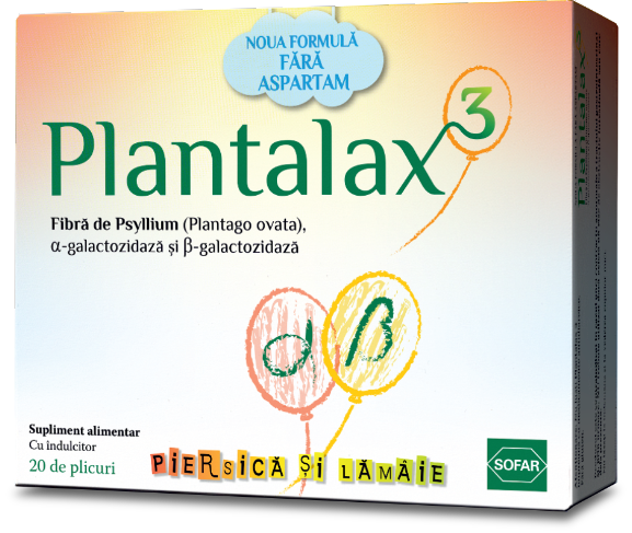 Plantalax este un supliment alimentar pe bază de fibre Psyllium (Plantago ovata) și enzime: α-galactozidază și β-galactozidază, care reglează tranzitul intestinal și ajută la reducerea senzației de disconfort dată de balonare, asociată în unele cazuri cu digestia dificilă a anumitor alimente.
