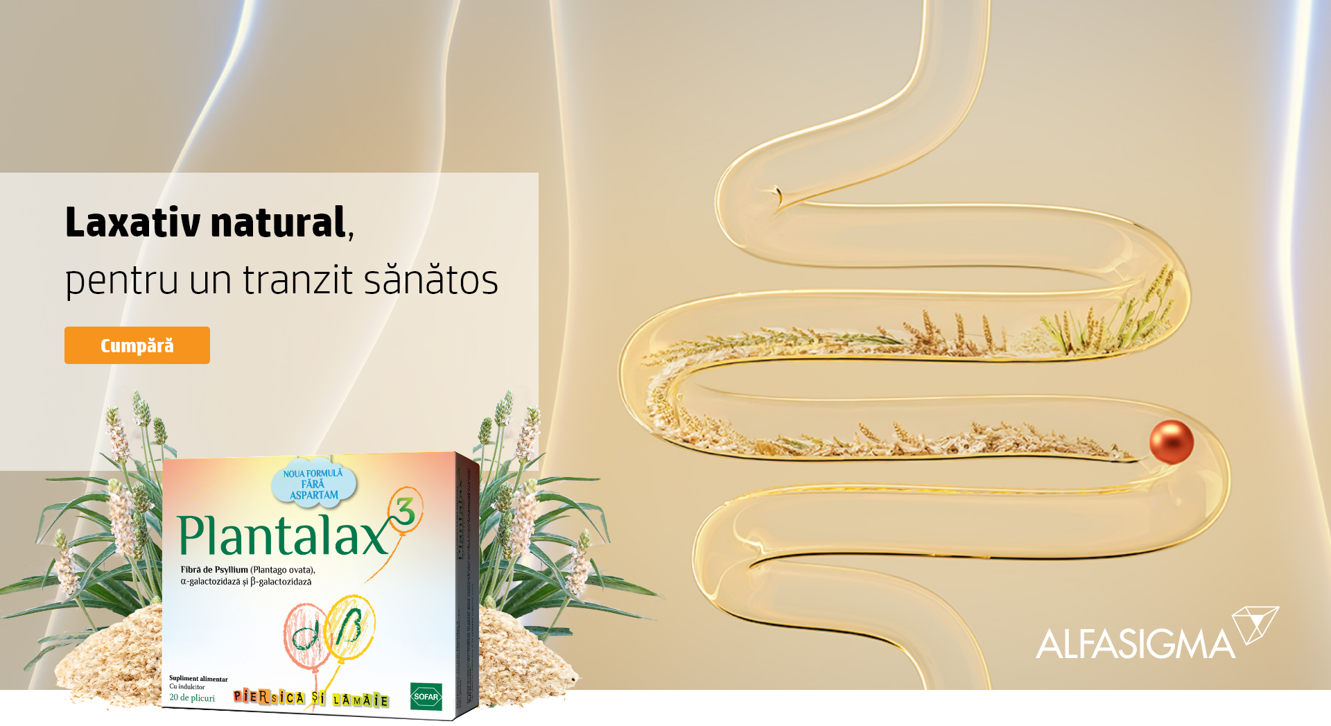 Plantalax este un supliment alimentar pe bază de fibre Psyllium (Plantago ovata) și enzime: α-galactozidază și β-galactozidază, care reglează tranzitul intestinal și ajută la reducerea senzației de disconfort dată de balonare, asociată în unele cazuri cu digestia dificilă a anumitor alimente.